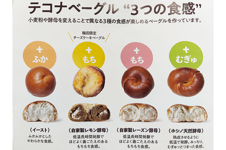 テコナベーグルは、3種の生地を商品ごとに使い分けているのが特徴。小麦粉や酵母、発酵時間を変えることで「むぎゅ」「もち」「ふか」という3つの食感を生み出している。