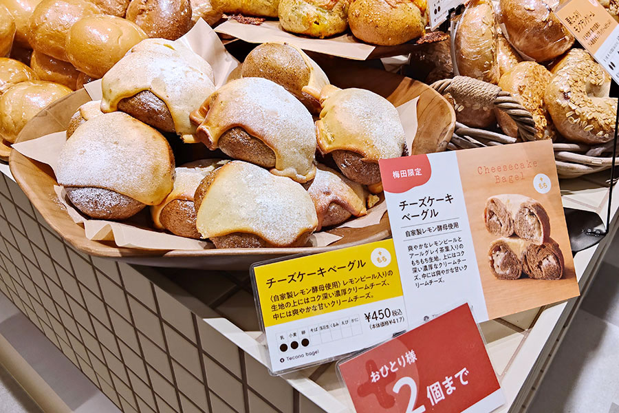 さらに、大丸梅田店限定で「チーズケーキベーグル」(450円/1人2個まで)が登場。自家製レモン酵母のもっちり生地にレモンピールとアールグレイ茶葉を練り込み、中には爽やかなクリームチーズ入り。仕上げにクリームチーズをトッピングし、濃厚な味わいに仕上がっている。