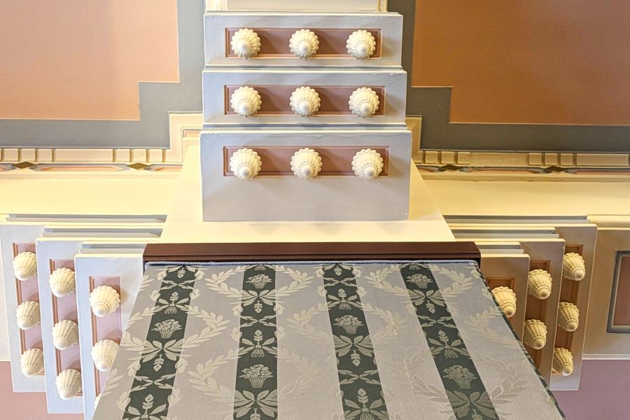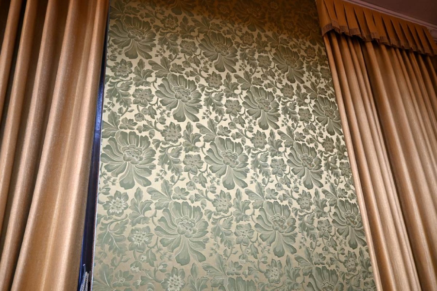 • 「市会議場」芍薬文様の光沢のある深いグリーンの壁布。以前の色見の再現にもチャレンジ「京都市庁舎」