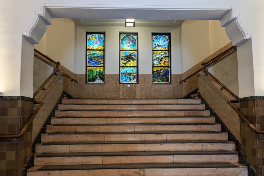 • 「京都市庁舎」入ってすぐの正面玄関には、佐々木真弓氏が制作のステンドグラス