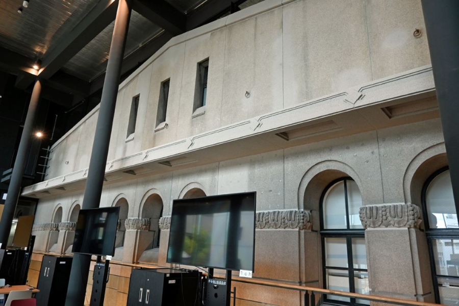 • 建物内に現れたもともとの外壁は、かなりのインパクト「京都市庁舎」