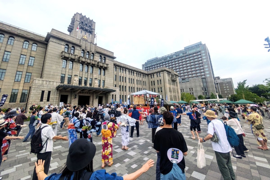 • 建物のすぐ目の前は「<span style="color: initial">京都市役所庁舎前広場</span>」として、休日にはフリーマーケットや音楽、食のイベントなどが開催される京都市のランドマーク的存在だ。写真は<span style="color: initial">毎年6月に開催される「郡上おどりin京都」</span>の様子(2025年6月撮影)