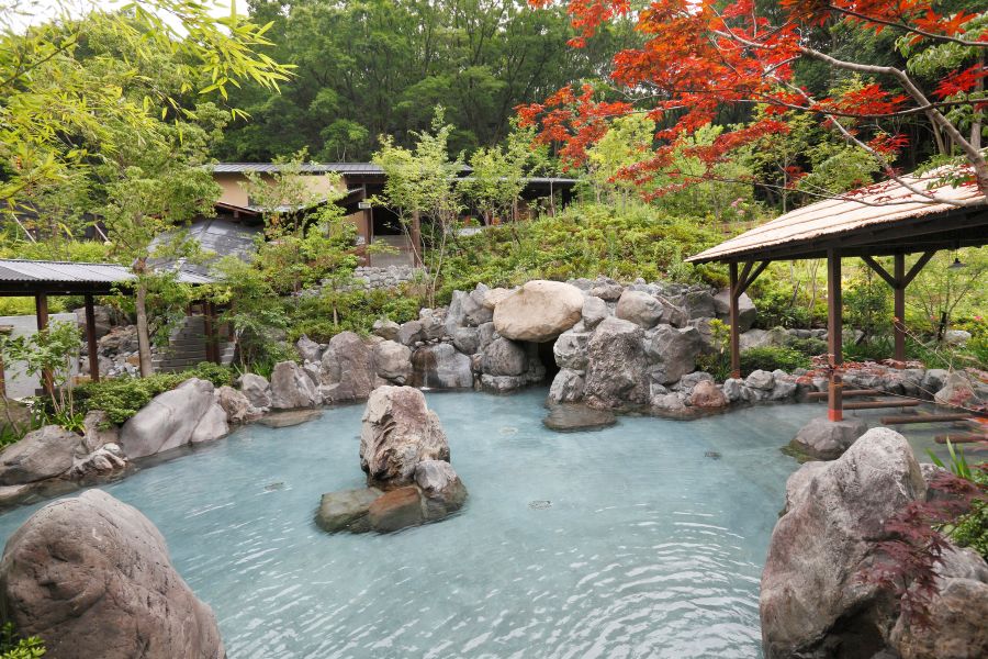 • 大岩の洞窟につながる「岩風呂」、小道の先には間近にまで木々が迫る秘湯「杜乃湯」など、さまざまな露天風呂があり、ここでも大自然を満喫できる
