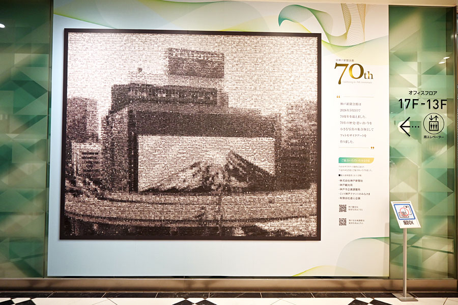 これを記念して、「ミント神戸」2階特設会場にて、『旧神戸新聞会館70周年記念パネル展』を開催。圧巻は、懐かしの富士山の巨大壁画を、9288枚の写真で再現したフォトモザイクアート。よく見ると、昔の神戸や「旧神戸新聞会館」に関連する写真と、現在のミント神戸で働く人などの新旧写真が織り交ぜて作られている。
