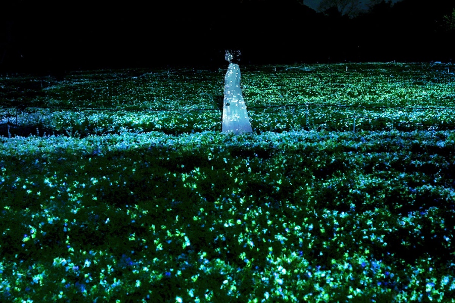 • 「チームラボ ボタニカルガーデン 大阪」(大阪市東住吉区)チームラボ《生命は闇に浮かぶまたたく光 – ネモフィラ》©チームラボ