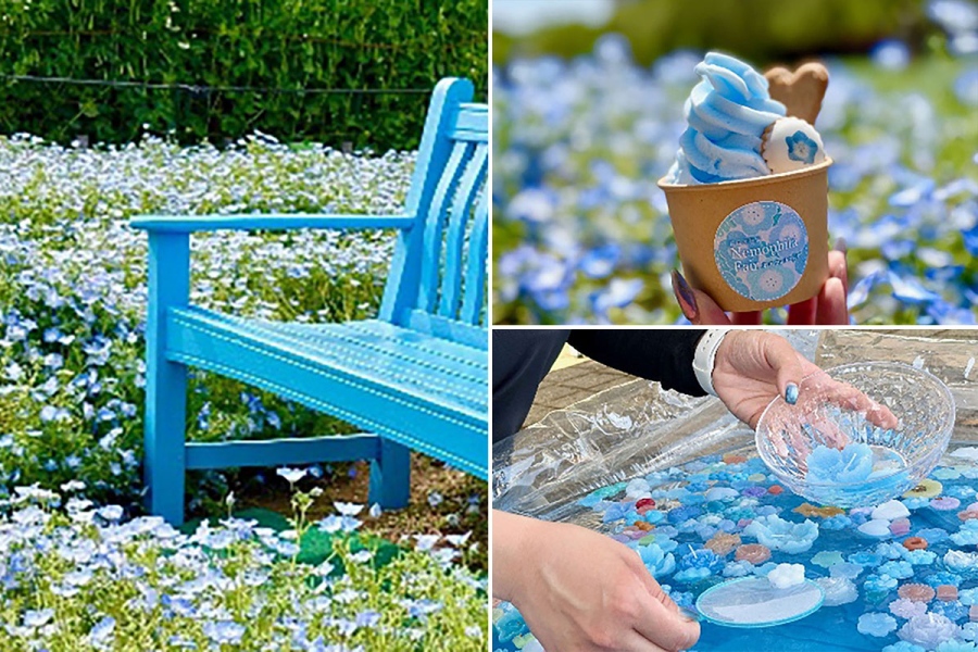 • 写真右上から時計回りに、ネモフィラソフトクリーム(500円)、ネモフィラキャンドルすくい(1回・500円)、フォトスポット「青いベンチ」