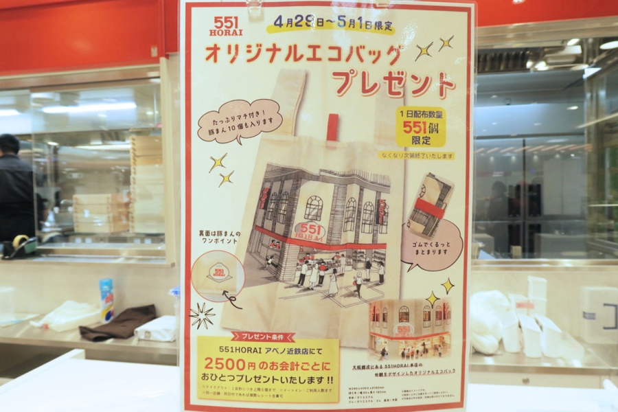 オープニング企画として、5月1日までの期間中は、2500円の会計ごとに「551蓬莱 本店」の外観が描かれた「オリジナルエコバッグ」を配布。1日551個限定のため、早めの来店がおすすめだ。