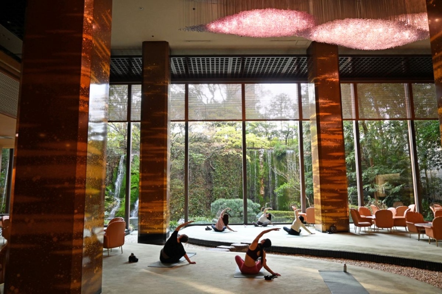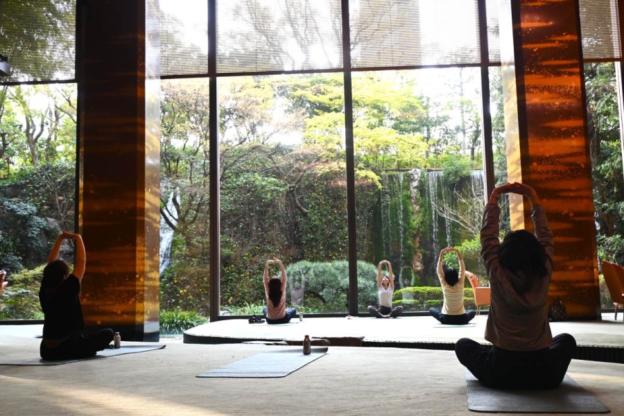 メインラウンジで、この日、早朝7時からおこなわれたのは「リラックスヨガ体験」。広い空間の中で、最大6名だけが体験できる贅沢なこの時間は、普段は聞こえない滝の音が感じられるほどの静寂に包まれる。
