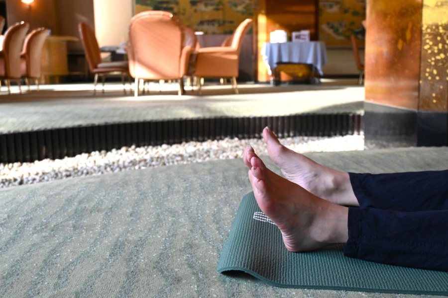 塚本さんは、「ホテルのこの広いラウンジで通常寝転ぶことはありませんよね。この空間を思いきり楽しんでいただけるように、天井を見上げるようなポーズを増やしています」と、特別な空間で実施するヨガならではの構成を考えていると明かす。