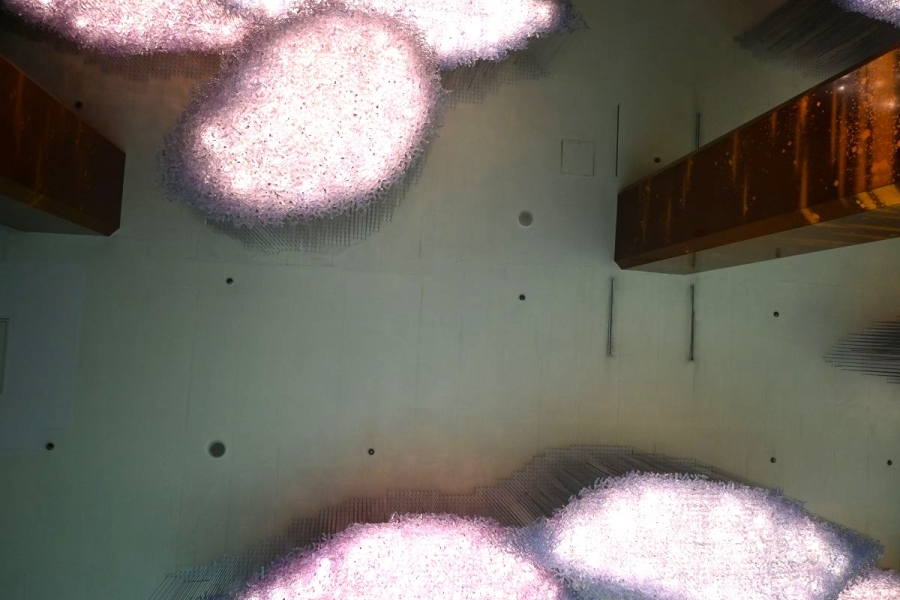 そして、最後にあおむけのポーズ「シャバーサナ」で、ヨガマット上で完全に横になると、いつもより金蒔絵の柱や、約25万個のクリスタルガラスが贅沢に使用されたシャンデリア「紫雲」が高く感じられた。