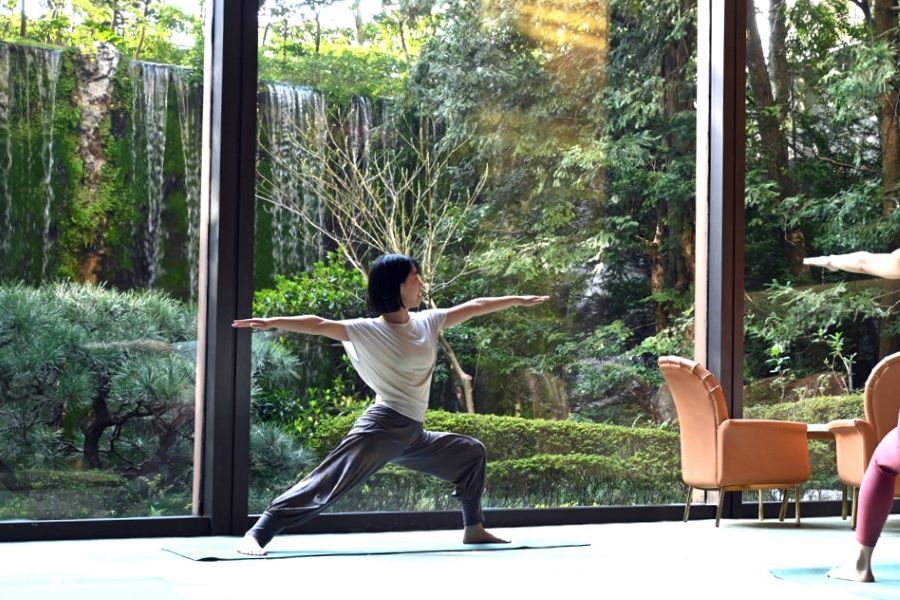目の前の大きな窓から降り注ぐ朝日浴び、日本庭園の新緑の美しさも楽しみながら、最初は座位のポーズからスタート。後半は立位のポーズにも挑戦していく。時間の経過とともにどんどん、窓の外の天候や太陽の動きにも敏感になってくる。