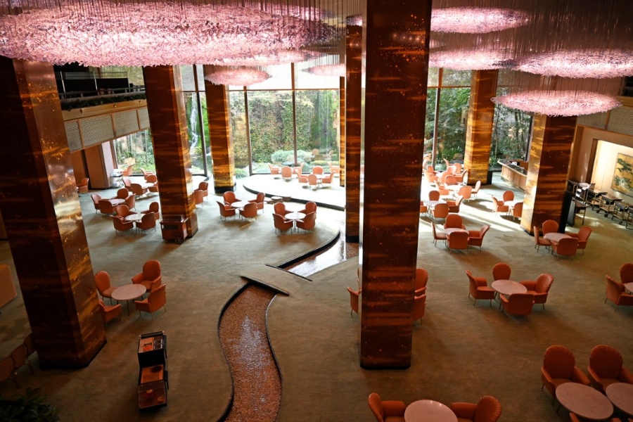 吹き抜けになった2階から見下ろすと、ティータイムを楽しむ人たちが花のような形の椅子でくつろぎ、その間を流れるような所作で着物のスタッフがサービスをおこなっている。そんなメインラウンジの営業前、誰もいない静かな空間で、週に1度だけ開催される宿泊者のみが参加できる、意外な特別な体験とは?現地を取材した。