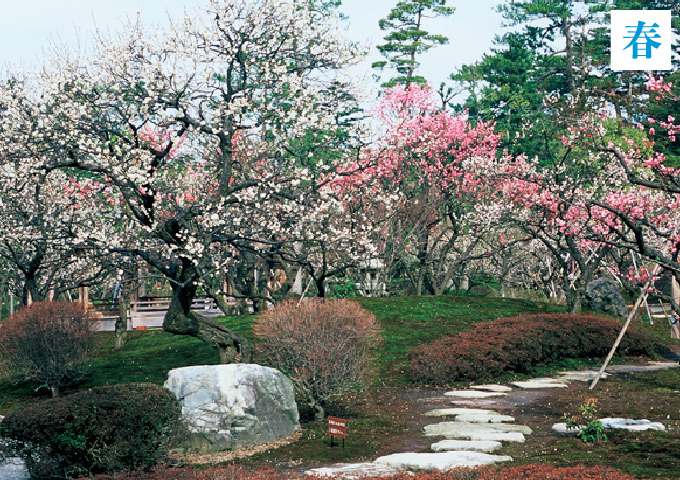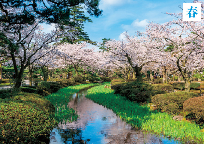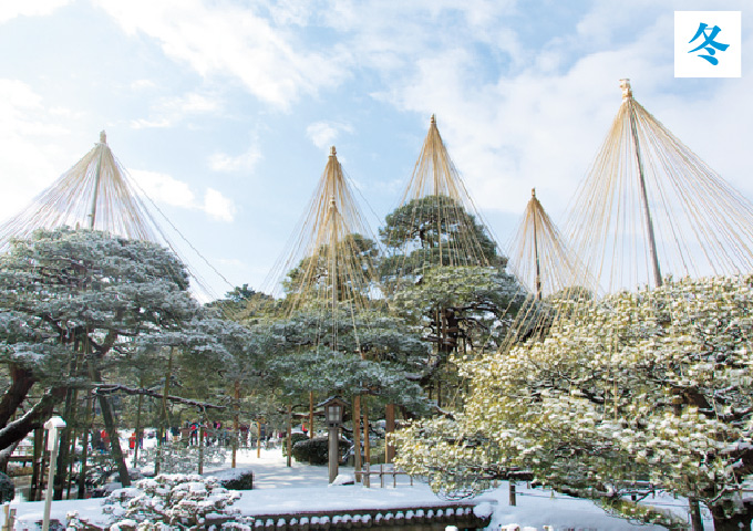 約180年の長い年月をかけ、歴代加賀藩主により造られた大名庭園。日本三名園の一つに数えられ、多様な時代の庭園技法を駆使して造られた庭には池、築山、茶屋などが点在する。ほかの大名庭園に比べて手を加えない自然な形が魅力。